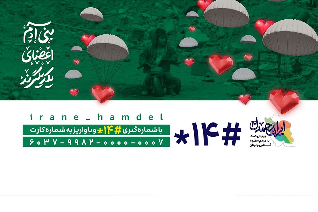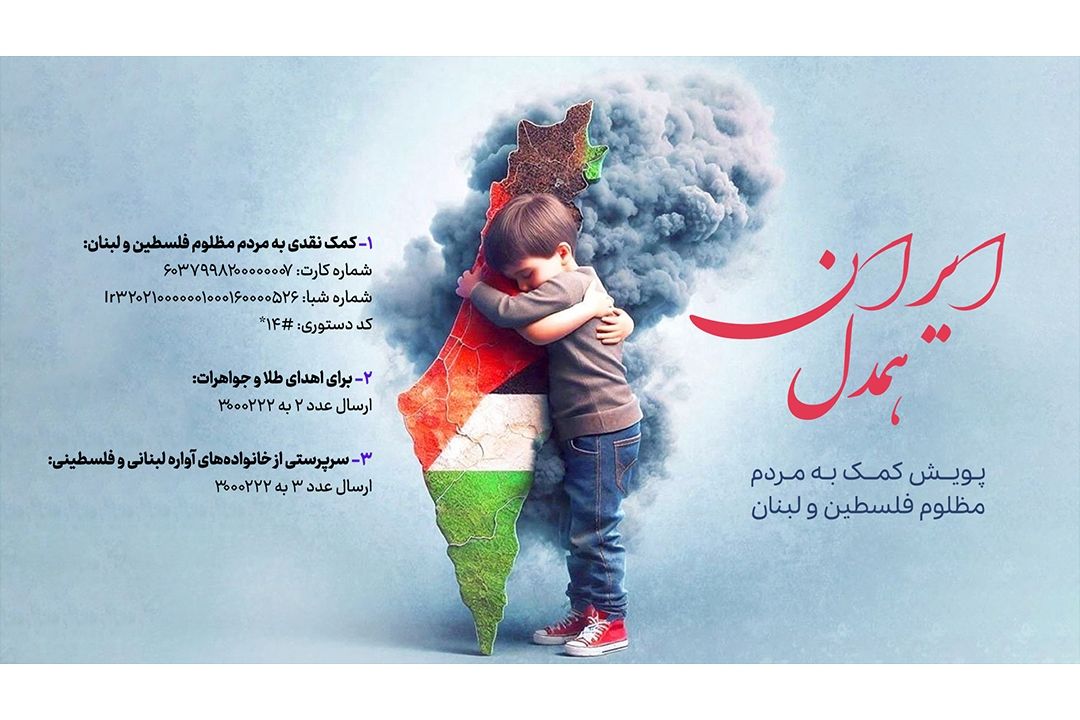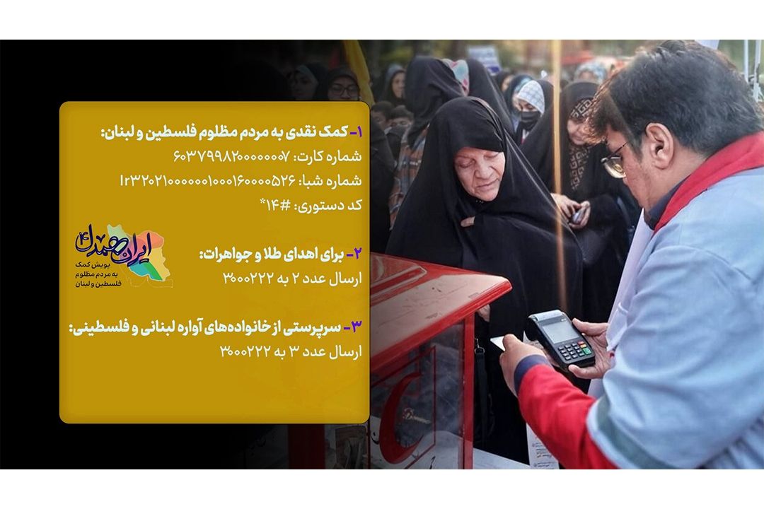 🔹1-جهت كمك نقدی به مردم مظلوم فلسطین و لبنان از طریق زیر میتوانید اقدام كنید؛ شماره كارت: 6037998200000007 شماره شبا: Ir320210000001000160000526 كد دستوری: #14* 🔸2- برای اهدای طلا و جواهرات ارسال عدد ٢ به 3000222 🔹3- برای سرپرستی از خانوادههای آواره لبنانی و فلسطینی ارسال عدد 3 به 3000222 #ایران_همدل ----------- 📻 صدای پایتخت، صدای همدلی 〰️ F.M 94 🌐 فضای مجازی رادیو تهران 👈 [Tehraan360](https://zil.ink/tehraan360)